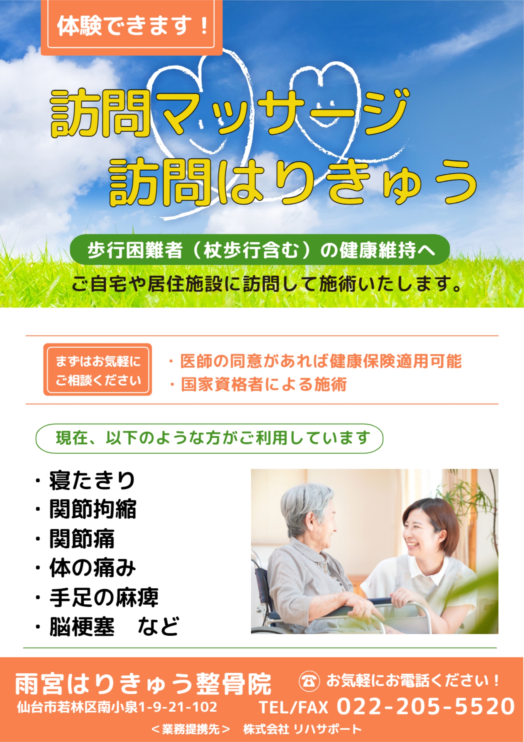 当事業は、仙台市若林区と太白区の鍼灸院と接骨院が共同でおこなっている、国家資格者による訪問マッサージ・訪問はり灸事業です。